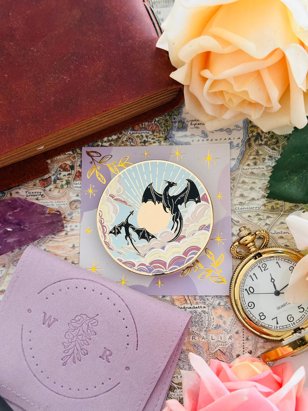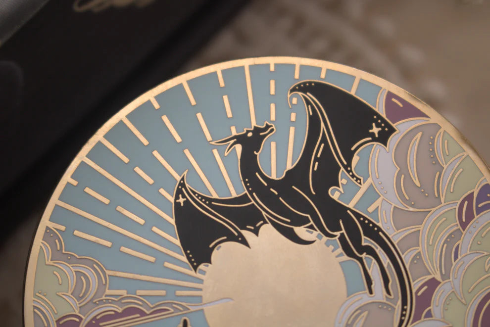 Het design toont twee draken die hun vleugels spreiden tegen een magische hemel. Een symbool van kracht, vrijheid en het vuur dat in elke lezer brandt. Perfect voor wie zich thuis voelt in verhalen vol avontuur, magie en drakenzielen.
